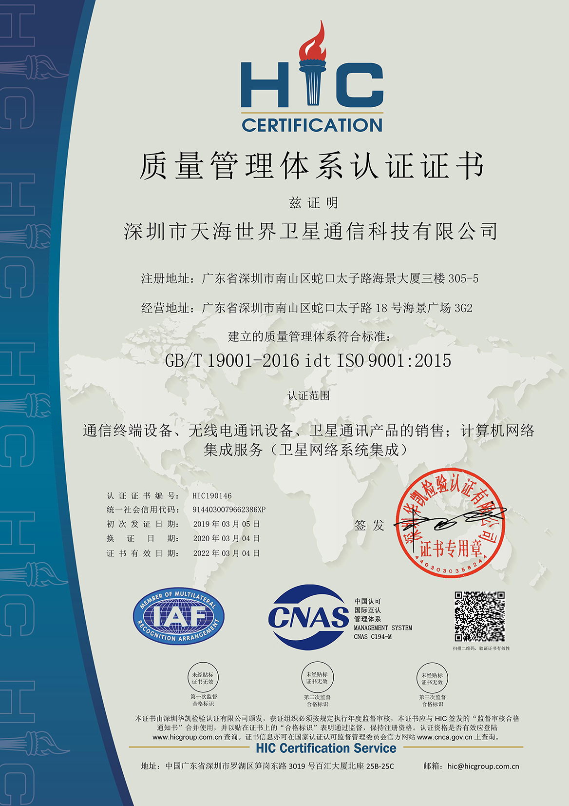 天海世界获得《质量管理体系质量认证证书》,认证范围为通信终端设备、无线电通设备、卫星通讯产品的销售;计算机网络集成服务 (卫星网络系统集成)。这一证书的颁发,体现了公司质量管理和质量保证能力符合相应标准,是对公司品质管理的认可。